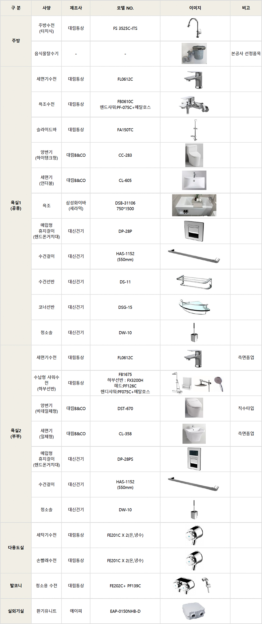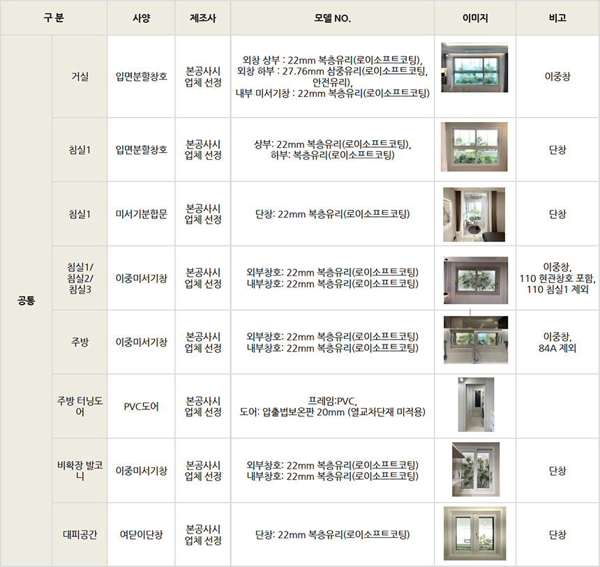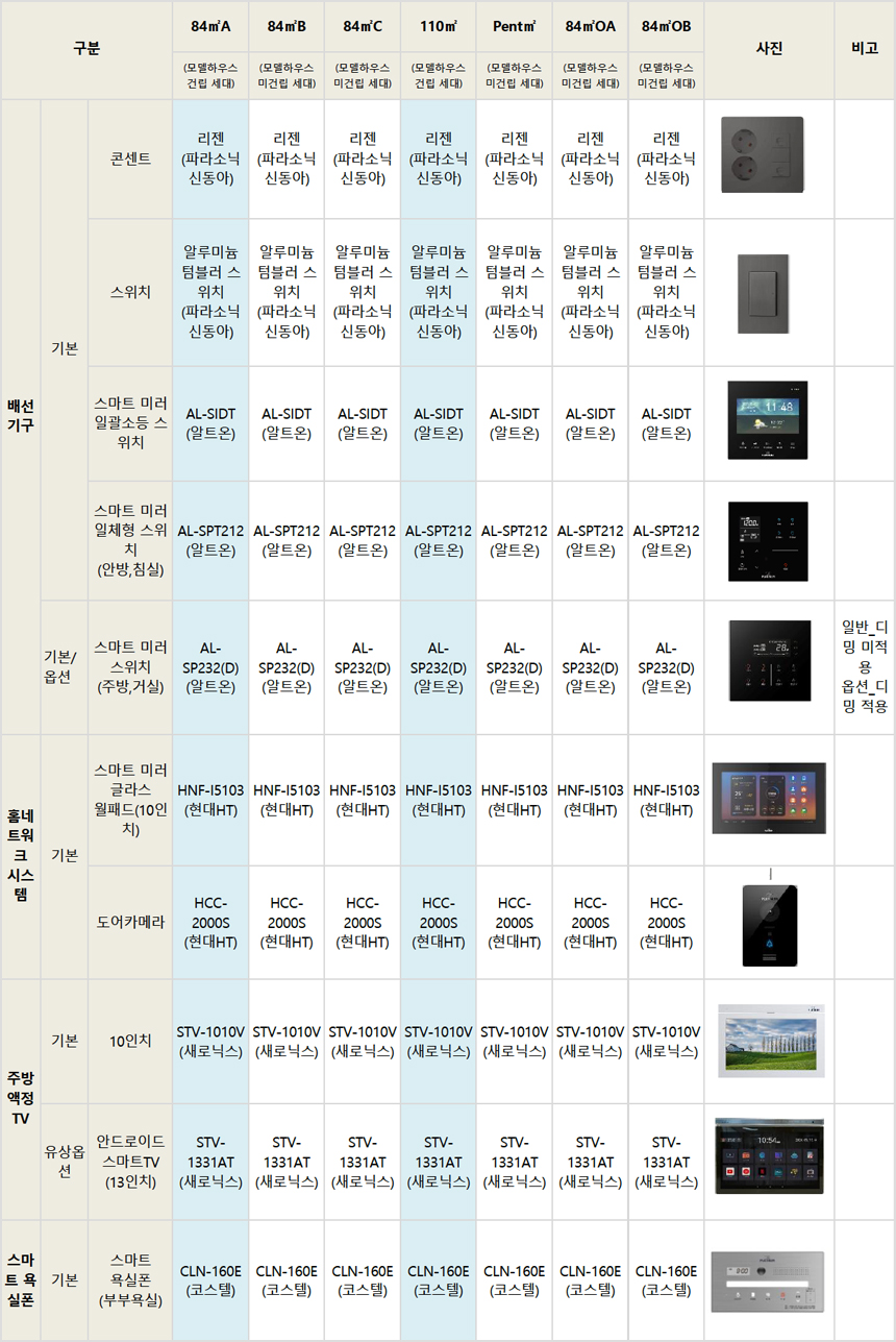 ※ 상기 마감자재는 홍보관 기준이며, 본 공사시 입찰을 통하여 브랜드가 재선정되며 동등 사양으로 변경될 수 있습니다.